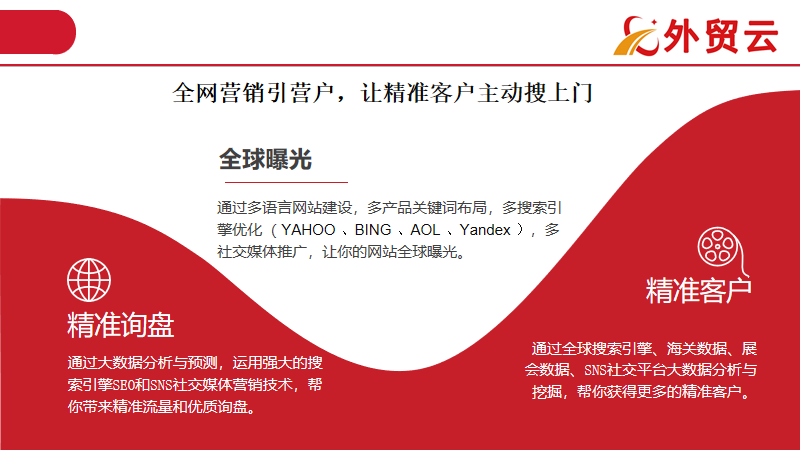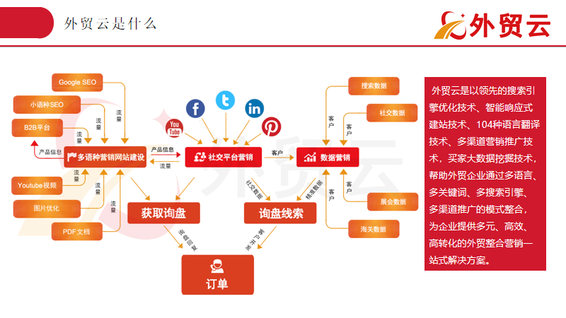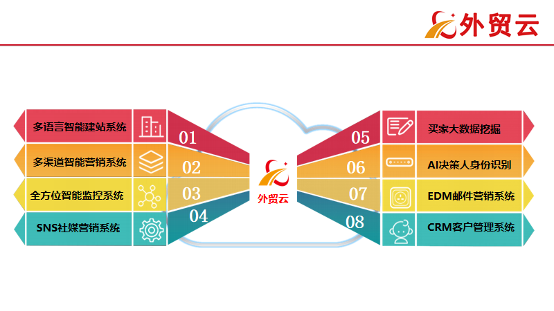 外贸云是以领先的搜索引擎优化技术、智能响应式建站技术、104种语言翻译技术、多渠道营销推广技术,买家大数据挖掘技术,帮助外贸企业通过多语言、多关键词、多搜索引擎、多渠道推广的模式整合,为企业提供多元、高效、高转化的外贸整合营销一站式解决方案。